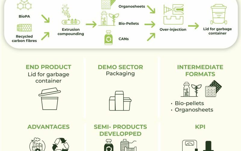 The process starts with BioPA and recycled carbon fibres, which are compounded through extrusion to create innovative bio-pellets and organosheets, integrated with Covalent Adaptable Networks (CANs). These intermediate formats are then used in an over-injection process to manufacture the final product: a robust, high-performance garbage container lid.