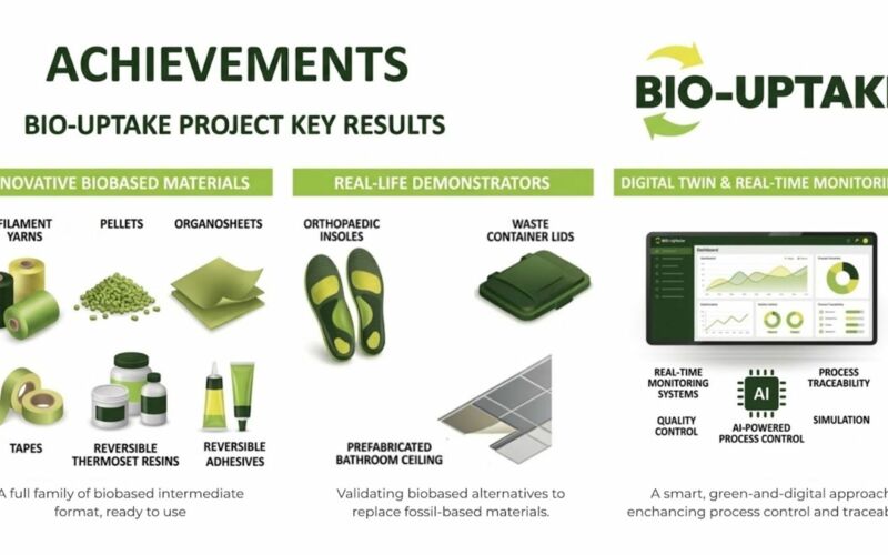 Proven Results: Our innovations are validated through three real-world demonstrators—orthopaedic insoles, waste container lids, and prefabricated bathroom ceilings—proving we can replace fossil-based materials with alternatives containing over 75% renewable content.